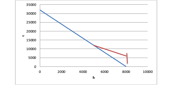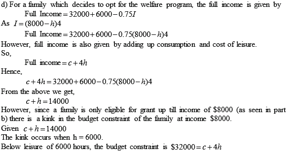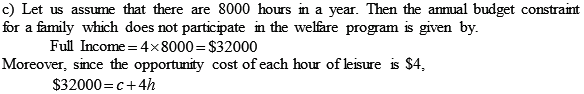 c. Assume the head of this family can earn $4 per hour and that the family has no other income. What is the annual budget constraint for this family if it does not participate in the welfare program? That is, how are consumption (c) and hours of leisure (h) related?