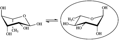 -Refer to instructions. Draw both chair conformations of the -anomer of rhamnose in its pyranose form. Circle the more stable conformation.