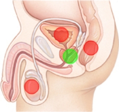 The nurse is instructing a patient who is beginning diagnostic tests for prostate cancer. Where should the nurse pinpoint the location of the prostate gland? Place an X at the location of the prostate gland on the figure.