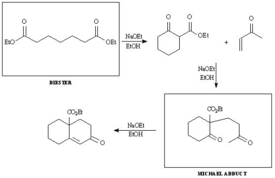 Provide the indicated starting material and intermediate in the synthetic sequence below involving a Dieckmann cyclization,followed by a Robinson annulation.
