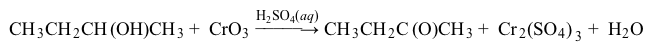 Reaction 1Next, a test for alcohols and aldehydes was performed by the addition of a drop of chromic acid reagent (CrO3 dissolved in aqueous H2SO4) into samples of the organic compounds. The disappearance of the orange color from chromic acid and formation of a blue-green suspension is indicative of a positive result for this test. Compound A was found to be an example of a positive result, as shown in Reaction 2.