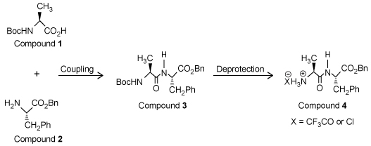 Solid-phase peptide synthesis is normally carried out on a resin bathed multiple times in dimethylformamide (DMF) -a toxic, polar, aprotic solvent-which poses an environmental problem because a large amount of toxic solvent waste is created. Cyclic carbonates such as propylene carbonate (PC) and ethylene carbonate (EC) are nontoxic, polar, aprotic solvents that could be used as an alternative to DMF.Compounds 1 and 2 are modified L-amino acids. They were coupled to form Compound 3, a dipeptide, which was then deprotected to yield Compound 4 (Figure 1) .