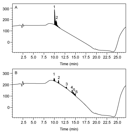 Figure 2 HPLC of synthetic bradykinin: (A) synthesis in DMF; (B) synthesis in PC
