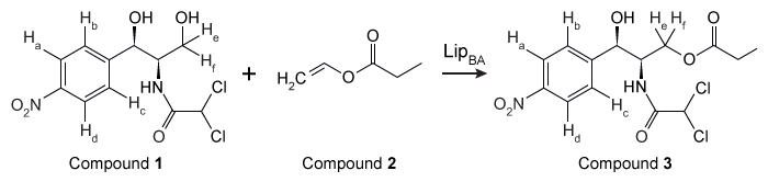 Chloramphenicol (Compound 1) is an antibiotic that acts against gram-positive and gram-negative bacteria by blocking peptidyl transfer, which inhibits protein synthesis by bacterial ribosomes. However, it tastes bitter, so most patients cannot tolerate it. As a result, synthesis of hydroxyl-substituted chloramphenicol analogues has become of interest because ester chloramphenicol analogues taste better than chloramphenicol. Substituents on the primary hydroxyl group of chloramphenicol analogues are typically hydrolyzed quickly in vivo to regenerate Compound 1. Compound 3, a chloramphenicol analogue, was synthesized by the transesterification of Compound 1 and vinyl propionate (Compound 2) , catalyzed by the enzyme LipBA lipase (Figure 1) .
