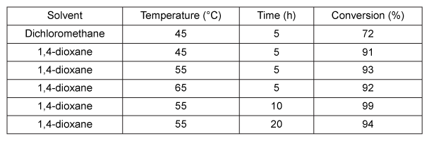Figure 1 Transesterification of chloramphenicol catalyzed by LipBAAlthough enzyme catalysis allows for efficient regiospecific and stereospecific bond formation, the reaction conditions for the conversion efficiency of Compound 1 to Compound 3, as well as the purity of Compound 3, must also be optimized. The reaction solvent, temperature, and time were studied to find the conditions that gave the highest conversion rate and purity. Each parameter was altered individually while all others were kept constant, and the enzyme concentration was 4.5 g/L in each trial. The results of this study are shown in Table 1. The purity of Compound 3 was found to be over 90% when 1,4-dioxane was used and over 70% when dichloromethane was used.Table 1 Transesterification Conditions Optimization
