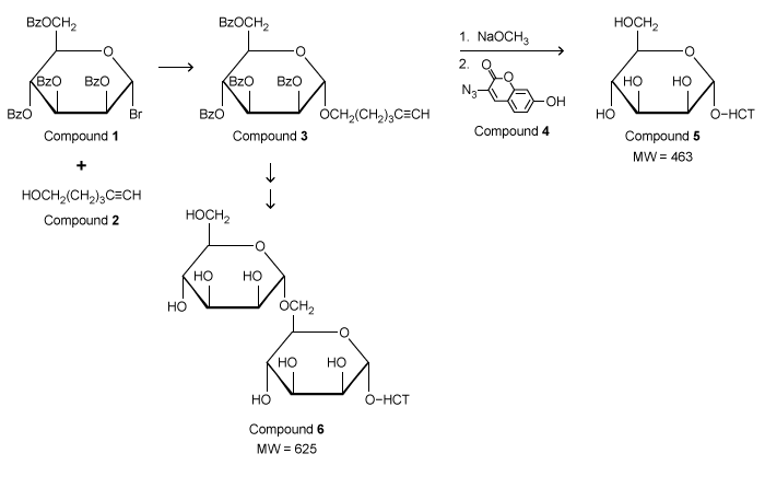 Figure 1 Synthesis of fluorescent coumarin derivatives (Note: HCT denotes the fluorescent butyl hydroxycoumarin triazole group.) Small vesicles called microsomes were isolated from Euglena gracilis membranes, and microsomal glycosyltransferase activities were investigated using a hexose donor substrate and either Compound 5 (Figure 2) or Compound 6 (Figure 3) as the acceptor substrate. Thin-layer chromatography (TLC) analysis indicated the formation of a new product in each assay. These products were purified and characterized by liquid chromatography-mass spectrometry (LC-MS) . The molecular ion for each product was subjected to another round of MS, in which individual hexose units (MW) = 162) were cleaved from the coumarin derivatives that were formed during the assay. The MW of hydroxycoumarin triazole (HCT) is 301.