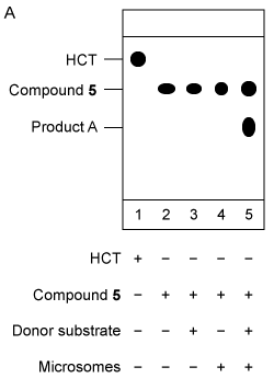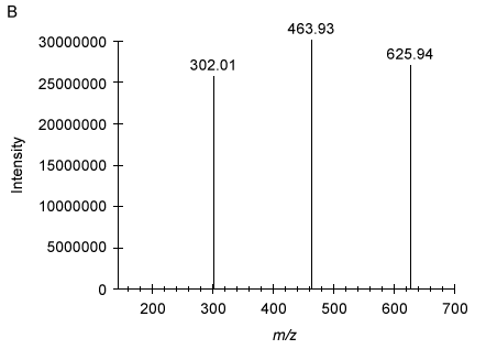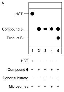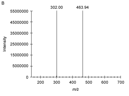 Figure 3 Analysis of Compound 6 as the acceptor substrate: (A) TLC analysis of fluorescent products; (B) Mass spectrum of product B fragmented molecular ion peak