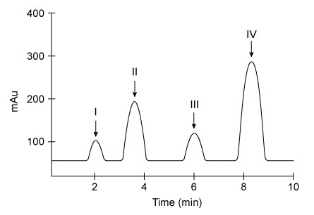The above chromatogram shows the separation of a mixture containing an ester, a carboxylic acid, an alcohol, and an alkane. If normal-phase high-performance liquid chromatography is used to separate the mixture components, which peak corresponds to the alcohol?