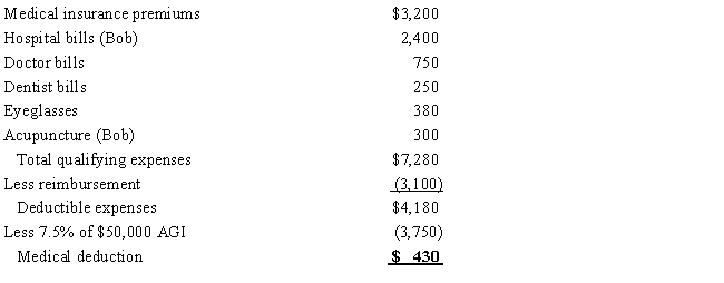 For 2015, Betsy and Bob, ages 62 and 68, respectively, are married taxpayers who file a joint tax return with AGI of $50,000. During the year they incurred the following expenses: