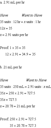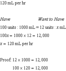 Ordered: 1000 ml of 0.9% sodium chloride with 100 units Humulin regular (R) insulin to infuse at 12 units per hr until the blood sugar level is stabilized at 150 mg per dL . At how many mL per hr will you set the infusion device?