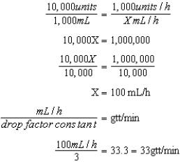 One of your patients has an IV that is flowing at a rate of 10 gtt/min. The IV bag contains a solution of 500 mL NS with 20,000 units of heparin. The drop factor is 15 gtt/mL.