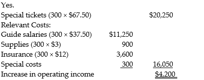 A group of foreign tourists has offered Muskoka Travel a proposal of 300 guide-days in July if they will cut the fee to $67.50 per guide-day. They have their own food and do not want to use the Muskoka Travel menus. Muskoka Travel will incur $300 in additional costs for busing the tourists back and forth to the camp site. If fixed costs would not increase, should Muskoka Travel accept the special offer?