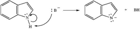 Refer to instructions.Indole can function as a Brønsted-Lowry acid in the presence of strong bases.Formulate a reaction,using a generic base (:B-),showing electron flow with arrows,that demonstrates this reactivity of indole.