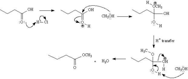 Draw the mechanism of the Fischer esterification of butanoic acid,in the presence of ethanol and hydrochloric acid,which is the catalyst.