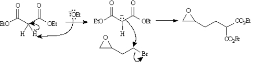 Refer to Exhibit 22-5.Conversion of B into C involves hydrolysis of the ester followed by decarboxylation.On the structures provided below,show the electron flow for the decarboxylation step.