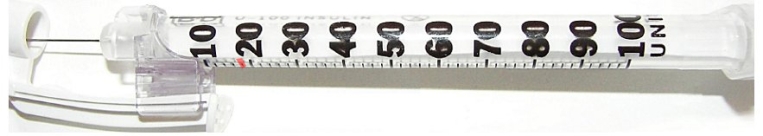 Place an arrow on the most appropriate syringe indicating the dose if the amount to be administered is 25 units of U-100 insulin.