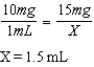 Given: Compute the amount of medication that will be given to administer one dose of the following medication orders. Round all parenteral administration orders that are over 1 mL to one decimal place. Round all parenteral administration orders under 1 mL to two decimal places. Do not include zeros at the end of decimal numbers. The problems and drug orders are presented for practice only, and actual prescribed dosages will vary according to a patient's age, condition, reaction, additional medications, and other factors.
