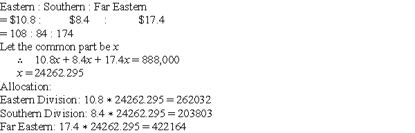 Manufacturing overhead is charged to three operating divisions on the basis of capital investment in the three divisions. If the investment is $10.8 million in the Eastern Division, $8.4 million in the Southern Division, and $17.4 million in the Far Eastern Division, how should manufacturing overhead of $888 000 be allocated to the three divisions?