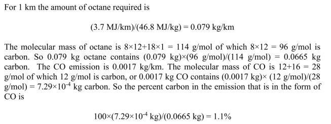 the combustion of gasoline (mostly octane) and emits 1.7 g/km of CO, what fraction of the