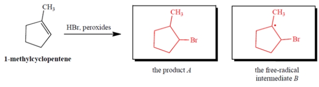 Give the product A that results when HBr undergoes peroxide-mediated addition to 1-methylcyclopentene. Also give the structure of the free-radical intermediate B (other than Br.) in the propagation steps of this reaction.  <div style=padding-top: 35px>