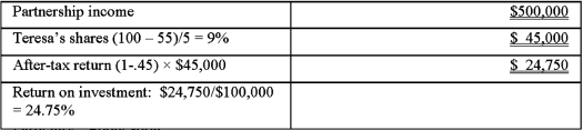 Teresa White is one of 5 equal limited partners in House Designs Enterprises (HDE).She contributed $100,000 five years ago when the enterprise began.During the year,HDE generated pre-tax profits of $500,000.The sole general partner,Betty Carmel,receives 55% of the company's profits.Both Teresa and Betty are subject to a 45% marginal personal tax rate.