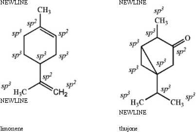 Specify the hybridization of each carbon atom of limonene,a natural product present in citrus fruits,and thujone,which is derived from wormwood,a traditional component of the notorious liquor,Absinthe.