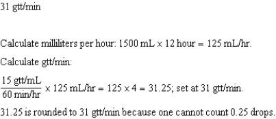 The order reads,"Give 1500 mL of normal saline over 12 hours.The tubing drop factor is 15 gtt/mL." The nurse will set the gravity drip infusion at how many drops per minute (gtt/min)._______