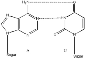 Draw and label an A-U base pair.Indicate all hydrogen bonds with a dashed line.