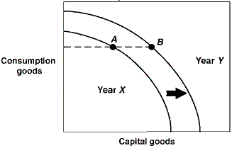 In Exhibit 2-18, the production possibilities curves for a country are shown for the years Year X and Year Y. Suppose this country was located at point A in Year X and point B in Year Y. This country: