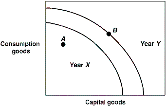 In Exhibit 2-19, the production possibilities curves for a country are shown for the years Year X and Year Y. Suppose this country was located at point A in Year X and would like to get to point B in Year Y. Construct a plan this country to activate in Year X to achieve this growth.