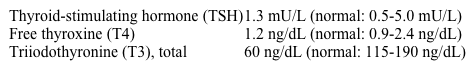 A 72-year-old man is hospitalized for cough, purulent sputum, and shortness of breath. His medical conditions include type 2 diabetes and hypertension. A chest x-ray reveals right lower lobe pneumonia, and treatment is started with supplemental oxygen and antibiotics. While hospitalized, the patient develops persistent sinus tachycardia. Thyroid function tests ordered during the subsequent work up reveal: