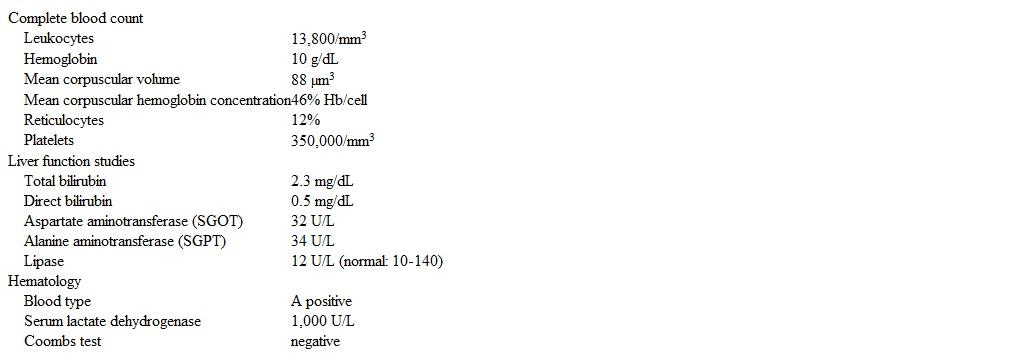 A 23-year-old man comes to the emergency department due to severe abdominal pain and fatigue. He has had nausea and vomiting for several hours and is unable to eat. He took ibuprofen but has had no pain relief. The patient has a history of anemia and dark brown urine that has not been evaluated because he tries "to avoid going to the doctor." Review of systems is otherwise negative, and he has no known medical conditions. He emigrated from Scotland during childhood but has not traveled outside the United States since. Temperature is 38.8 C (101.8 F) , blood pressure is 120/80 mm Hg, pulse is 102/min, and respirations are 16/min. There is tenderness in the right upper quadrant of the abdomen that is exacerbated by deep inspiration. Splenomegaly and jaundice are present. There are no peritoneal signs. The remainder of the examination is normal. Laboratory results are as follows: