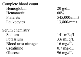 A 56-year-old man comes to the office due to an episode of transient right eye blindness that lasted an hour. He has had no weakness in his extremities or speech changes. He last saw a physician 3 years ago. The patient has smoked a pack of cigarettes daily for 30 years. Temperature is 37 C (98.6 F) , blood pressure is 160/94 mm Hg, pulse is 78/min, and respirations are 14/min. Pulse oximetry is 98% on room air. BMI is 32 kg/m2. There is no carotid bruit. Facial plethora is present. Cardiopulmonary examination is normal. Abdominal examination reveals splenomegaly. There is no lower extremity edema, and peripheral pulses are intact. Laboratory results are as follows: