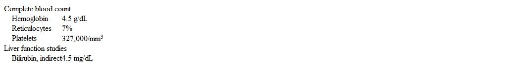 A 27-year-old man with sickle cell anemia comes to the emergency department due to increasing dyspnea that started 3 hours ago. The patient was seen in the emergency department 5 days ago for symptomatic anemia, and his hemoglobin level was 6.2 g/dL. He received a blood transfusion, after which his hemoglobin level improved to 8 g/dL, and he was sent home. Temperature is 38.1 C (100.6 F) , blood pressure is 105/66 mm Hg, pulse is 112/min, and respirations are 28/min. Oxygen saturation is 97%. The patient appears pale; scleral icterus is present. Lungs are clear. Abdomen is soft and nontender with no hepatosplenomegaly. Laboratory results are as follows: