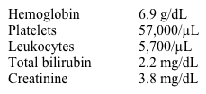 A 53-year-old woman recently diagnosed with systemic sclerosis comes to the emergency department with headaches, increasing dyspnea, malaise, and nausea. Her medications include lansoprazole for heartburn and nifedipine for finger discoloration and pain. Physical examination reveals a distressed and anxious woman. Her blood pressure is 235/117 mm Hg and pulse is 120/min. She has visible skin tightening over the face, forearms, chest, and legs. She has difficulty opening her mouth due to tightening of the skin around the mouth. Lung examination shows bibasilar inspiratory crackles. Laboratory studies are as follows: