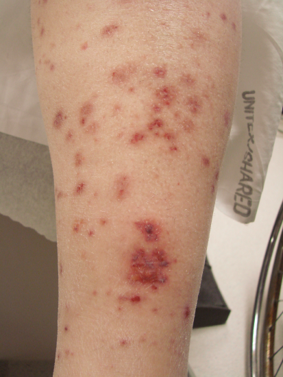A 2-year-old girl is brought by her parents to the emergency department due to fever. Approximately 10 hours ago, the patient had several episodes of vomiting and began to feel increasingly lethargic. Vaccinations are up to date. Temperature is 39.8 C (103.6 F) , blood pressure is 70/36 mm Hg, and pulse is 135/min. The patient is poorly responsive on examination. The abdomen is nontender and nondistended. A rash is present on the bilateral lower extremities. A representative photograph is shown below: