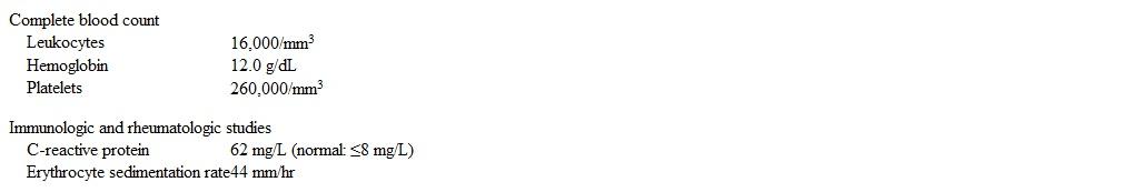 A 5-year-old boy is brought to the emergency department by his parents due to fever and knee pain. The patient was diagnosed with streptococcal pharyngitis 2 weeks ago and treated with a 10-day course of amoxicillin. Two days ago, he developed fever and fatigue and started eating and drinking less than usual. Today, he cries every time he bends his right knee, and he refuses to walk. Temperature is 39.4 C (102.9 F) . On examination, the patient appears tired but alert and is reading a book with his father. The right knee is swollen and tender to palpation. The patient holds the knee in a flexed position and has pain with passive range of motion. Laboratory results are as follows: