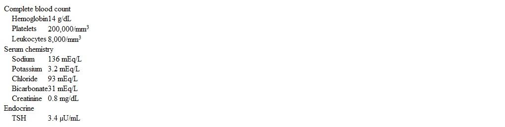 A 20-year-old woman comes to the office due to "feeling low" for the past 2 months. The patient says, "All I do is sleep and cry. I lost my job last week and now I have to move in with my parents. I feel like a failure." She is upset that she has gained weight and says, "My junk food cravings have gotten worse, but I've been too tired to go to the gym to make up for it." The patient does not use alcohol or illicit drugs and takes no medications. Medical history is insignificant. Temperature is 36.7 C (98.1 F) , blood pressure is 106/69 mm Hg, pulse is 90/min, and respirations are 16/min. On physical examination, the thyroid is normal to palpation. The lungs are clear to auscultation and heart sounds are normal. The abdomen is soft and nontender. Laboratory results are as follows: