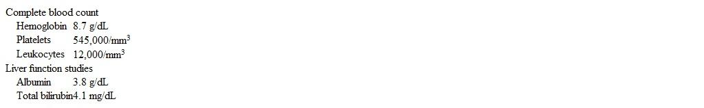 A 45-year-old man comes to the emergency department for colicky, right upper quadrant pain; vomiting; and melena for 24 hours. He has no hematemesis. Medical history is significant for nonalcoholic steatohepatitis, which was diagnosed by percutaneous liver biopsy 5 days ago. The biopsy also showed mild fibrosis around portal tracts without bridging fibrosis or regenerative hepatocyte nodules. Temperature is 37.4 C (99.3 F) , blood pressure is 95/60 mm Hg, pulse is 110/min, and respirations are 15/min. Scleral icterus is present. Cardiopulmonary examination is unremarkable. The abdomen is tender to palpation in the right upper quadrant. Laboratory results are as follows:
