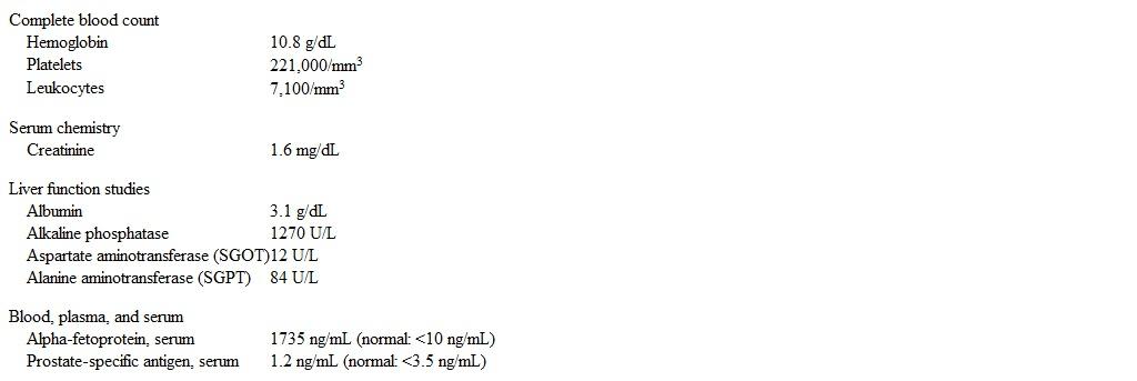 A 50-year-old man comes to the office due to a few weeks of fatigue and back pain. The patient has a history of hypertension and major depressive disorder. He does not use alcohol or intravenous drugs. The patient emigrated from Vietnam with his family when he was a child. BMI is 21 kg/m2. Vital signs are within normal limits. Physical examination reveals temporal wasting. Cardiopulmonary examination is normal, and no abdominal masses or tenderness is present. Spine palpation reveals significant pain over a mid-lumbar spinous process. There are no palpable testicular lesions, and digital rectal examination reveals a smooth, normal-sized prostate. Laboratory results are as follows: