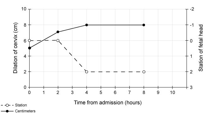 A 23-year-old woman, gravida 1 para 0, at 41 weeks gestation is admitted to labor and delivery for contractions over the past 3 hours. The patient has no chronic medical conditions. She had an elevated 1-hour glucose challenge test but normal 3-hour glucose tolerance test at 28 weeks gestation. The patient receives epidural analgesia immediately upon admission and has spontaneous rupture of membranes 2 hours after admission. An intrauterine pressure catheter is placed for variable decelerations, which resolve with an amnioinfusion. Her cervical examinations are shown below: