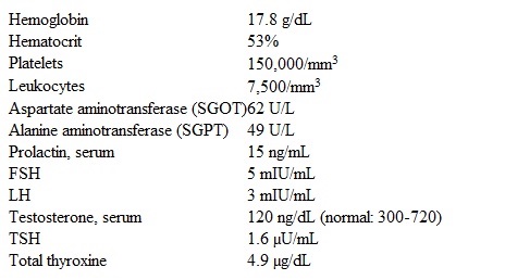 A 25-year-old man comes to the office due to decreased libido, fatigue, and weight gain. For the last few months, the patient has been unable to attain a satisfactory erection during intercourse with his girlfriend. He has had no headaches, blurred vision, fever, nausea, or vomiting. The patient has had no significant prior medical problems and takes no prescription medications but does take several over-the-counter supplements to boost his metabolism. He does not use alcohol, tobacco, or illicit drugs. His mother was treated for non-Hodgkin lymphoma, and his father has no major medical problems. Blood pressure is 130/70 mm Hg and pulse is 56/min. The patient appears fit and well-built with no significant abnormalities noted on examination. Laboratory results are as follows: