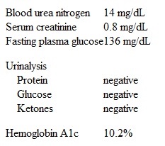 A 26-year-old man comes to the office for a new patient visit. Three months ago, he was seen at an urgent care clinic for excessive thirst and frequent urination. Laboratory evaluation at that time revealed blood glucose of 384 mg/dL, normal anion gap, and hemoglobin A1c of 11.4%. Several medications were prescribed, but the patient was able to afford only regular insulin. He has been taking the insulin before meals, which has improved symptoms. Home fingerstick glucose readings have usually been at 100-300 mg/dL but have dropped as low as 65 mg/dL after he skipped a meal. The patient has complied with a diabetic dietary regimen but sometimes eats "junk food" when busy at work. Medical history is otherwise unremarkable. The patient's mother and sister have hypothyroidism, and his father died at a young age from a motor vehicle collision. There is no family history of diabetes mellitus. The patient is employed as a construction worker and does not use alcohol, tobacco, or illicit drugs. Blood pressure is 127/78 mm Hg and pulse is 76/min. BMI is 24 kg/m2 and waist circumference is 83.8 cm (33 in) . Physical examination, including monofilament testing of the feet, is normal. Laboratory results are as follows: