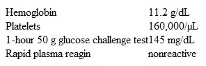 A 29-year-old woman, gravida 1 para 0, at 26 weeks gestation comes to the office for a routine prenatal visit. She reports no contractions, vaginal bleeding, or leakage of fluid. There is good fetal movement. The patient has a history of polycystic ovarian syndrome. This pregnancy was conceived through ovulation induction but has otherwise been uncomplicated. She has no other chronic medical conditions or previous surgeries. The patient walks for 30-45 minutes 5 days a week. She takes prenatal vitamins and folate supplementation daily. She does not use tobacco, alcohol, or illicit drugs. Blood pressure is 130/80 mm Hg and pulse is 89/min. BMI is 27 kg/m2. Fetal heart tones are 150/min. Fundal height is 28 cm. Third-trimester laboratory results are as follows: