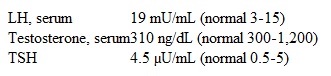 A 66-year-old man is found to have bilateral breast enlargement during a routine office visit. The patient reports no breast pain/discomfort, headaches, or vision abnormalities but has had decreased libido and "low energy" for the past several months. Medical problems include hypertension, hyperlipidemia, and osteoarthritis. The patient takes chlorthalidone, simvastatin, and acetaminophen as needed. He does not use over-the-counter or herbal supplements. The patient drinks 1 or 2 alcoholic beverages during social events and does not use tobacco or illicit drugs. He is married and has several adult children. Family history is notable for breast cancer in a maternal aunt. Vital signs are within normal limits. BMI is 32 kg/m2. Examination shows normal body hair distribution and no skin rash. Breast examination reveals 2-cm, round, and firm tissue behind the areolas bilaterally with no overlying skin changes or nipple discharge. There are no enlarged lymph nodes. External genitalia are normal in size and appearance, and no testicular masses are present. The remainder of the physical examination is normal. Laboratory results are as follows: