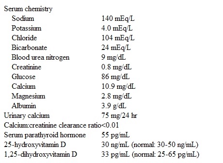 A 33-year-old woman comes to the office for evaluation of hypercalcemia. She was recently seen in the emergency department for uncomplicated appendicitis and was found to have a serum calcium level of 10.7 mg/dL. The patient underwent a laparoscopic appendectomy and was released the following day. Prior to this, she had not seen a physician in over 7 years. She now feels well and has no other medical problems. The patient has had 2 uneventful pregnancies and her menstrual periods are normal. She is divorced and currently not sexually active. She does not use tobacco, alcohol, or illicit drugs. Her mother has had "a high calcium level for a long time," but the patient does not know if she received any specific treatment. Blood pressure is 123/68 mm Hg and pulse is 87/min with regular rhythm. BMI is 22 kg/m2. Physical examination is normal with well-healing abdominal wounds. Laboratory results are as follows: