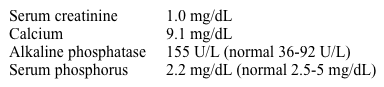 A 36-year-old woman comes to the physician due to low back pain. The pain began 5 months ago and is getting progressively worse. She describes it as aching, non-radiating, and without any aggravating or relieving factors. The patient underwent Roux-en-Y gastric bypass surgery for morbid obesity 2 years ago, after which she lost about 45.4 kg (100 lb) . She takes a daily multivitamin containing calcium (1200 mg elemental calcium) and vitamin D (400 IU of cholecalciferol) . She eats a normal diet. Spinal examination shows no focal tenderness. Laboratory results are as follows: