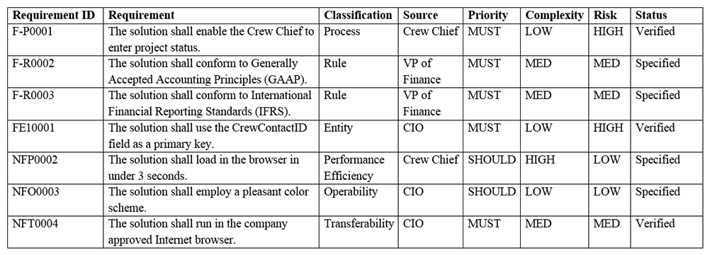 Company A is a nation-wide leader in commercial demolition. Having just celebrated its 100th year of operations, the company decided to begin doing work internationally. The current system used for reporting company finances is unable to keep pace with the potential demands of doing work in geographically dispersed locations. Therefore, the company decided to replace its client-based Profit & Loss (P&L) reporting system with a more robust, web-based system. This will ensure transparency across the organization and enable better decision making. The business analyst (BA) at Company A has recently completed several rounds of elicitation to determine the requirements for the new, web-based system. Over 1250 requirements were elicited. An initial Requirements Traceability Matrix (RTM) has been drafted, and a subset of the RTM can be seen below: