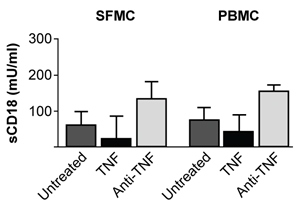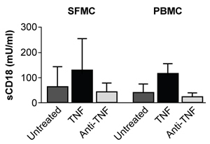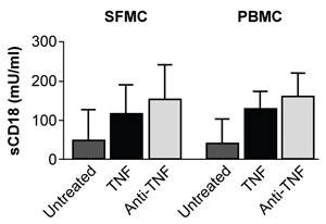 Figure 2 DAS28CRP scores in eRA patientsExperiment 3Heterogeneous populations of mononuclear cells were cultured from the synovial fluid (SFMC) and peripheral blood (PBMC) of eRA patients during an acute exacerbation of their symptoms. sCD18 levels were measured in SFMCs and PBMCs that were untreated, treated with TNF, or treated with monoclonal antibodies targeting TNF (anti-TNF) .