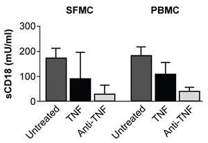 Rheumatoid arthritis (RA) is an autoimmune disease that causes chronic synovial (joint) inflammation. RA immunopathogenesis involves LFA-1, a surface receptor found on leukocytes that is composed of an α-chain (CD11a) and a β-chain (CD18) . The binding of LFA-1 to ICAM-1, an adhesion protein on the surface of B cells and endothelial cells, stimulates the migration of leukocytes to specific areas of inflammation. After successful LFA-1/ICAM-1 binding, CD18 is released into the plasma and synovial fluid (SF) , where it exists in soluble form (sCD18) . The levels of sCD18 in SF can be used as a marker for inflammation in RA.CD18 release has been shown to increase in response to tumor necrosis factor (TNF) , a pro-inflammatory cytokine involved in the inflammatory response of RA. In patients with newly diagnosed and untreated RA (eRA) , leukocytes produce adequate quantities of LFA-1 and plasma sCD18 levels are unchanged. However, over time there is dysregulation of LFA-1 synthesis and an increase in competition for ICAM-1 by other ligands, leading to a reduction in CD18 shedding. As a result, sCD18 is decreased in patients with chronic RA (cRA) .Experiment 1An immunofluorescence assay was used to measure plasma sCD18 levels in patients with eRA and cRA, and in age- and gender-matched healthy controls (HC) .